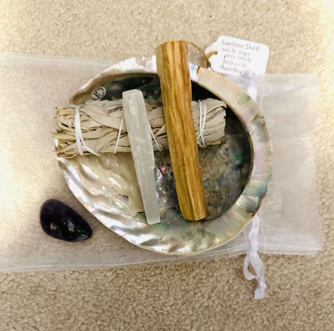 The gift set includes an Abalone shell, Palo Santo stick, Selenite wand, White sage and an Amethyst crystal.