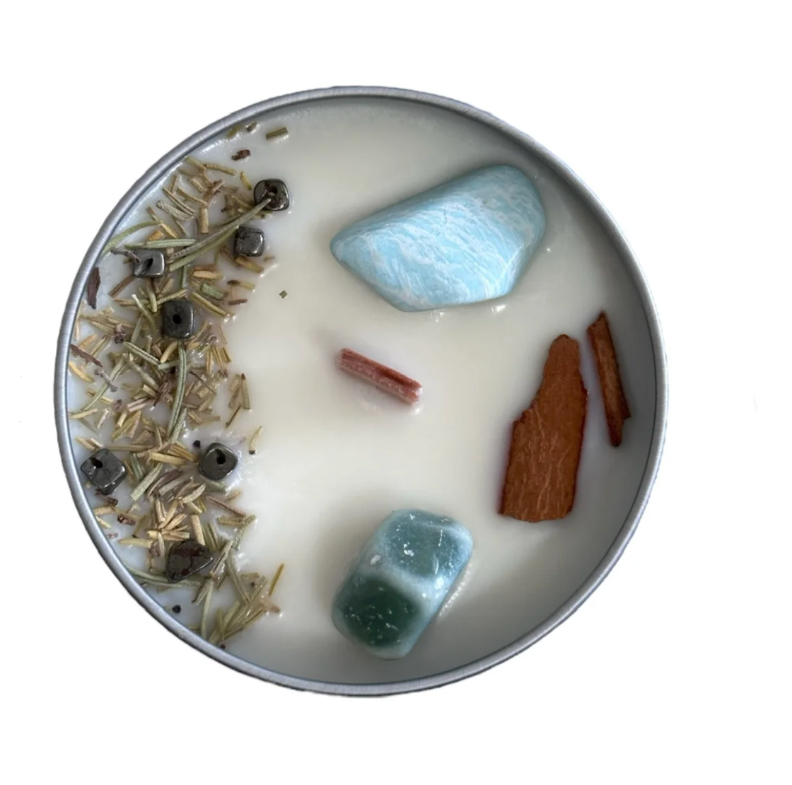 Rosemary, thyme, and a cinnamon stick have been added along with Amazonite, Aventurine, and Pyrite crystals.