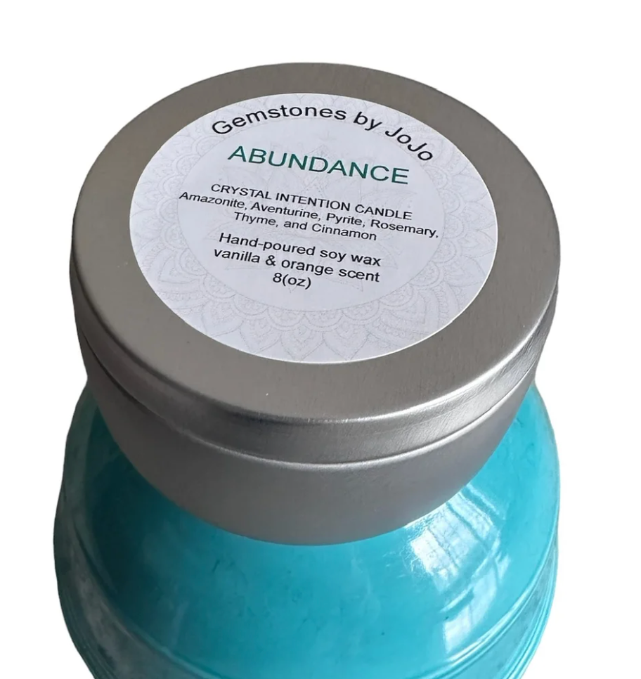 This 8oz Abundance crystal intention candle has a vanilla and orange scent made with soy wax.