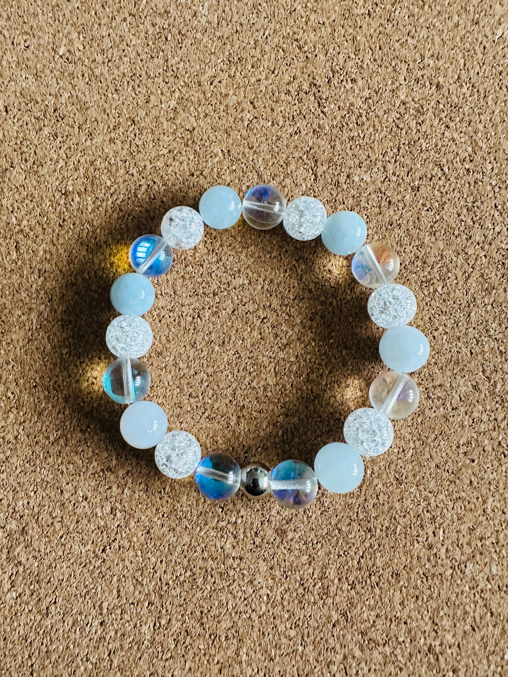 Aquamarine, Mermaid Glass, and Crackle Quartz 10mm Stretch Bracelet.