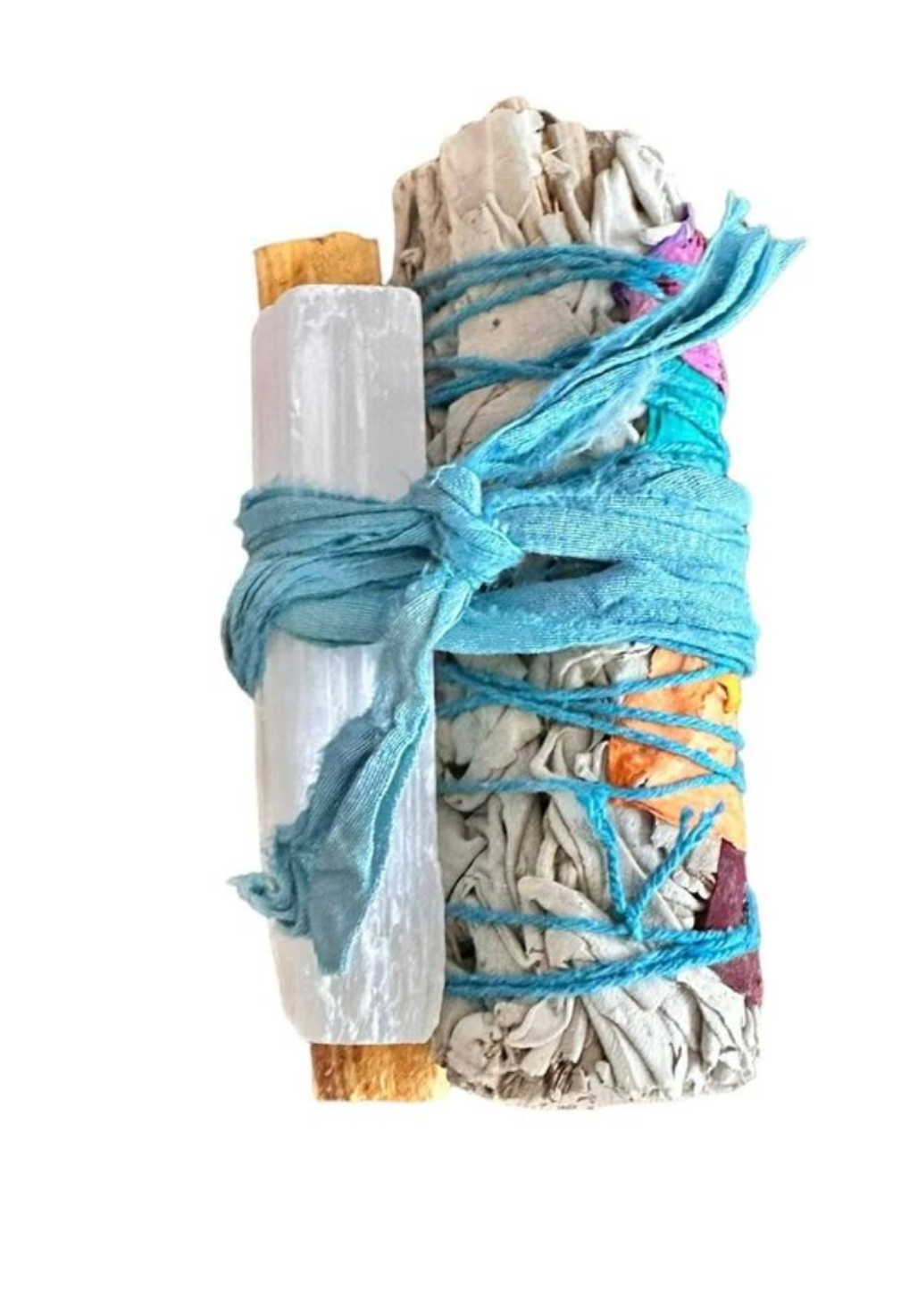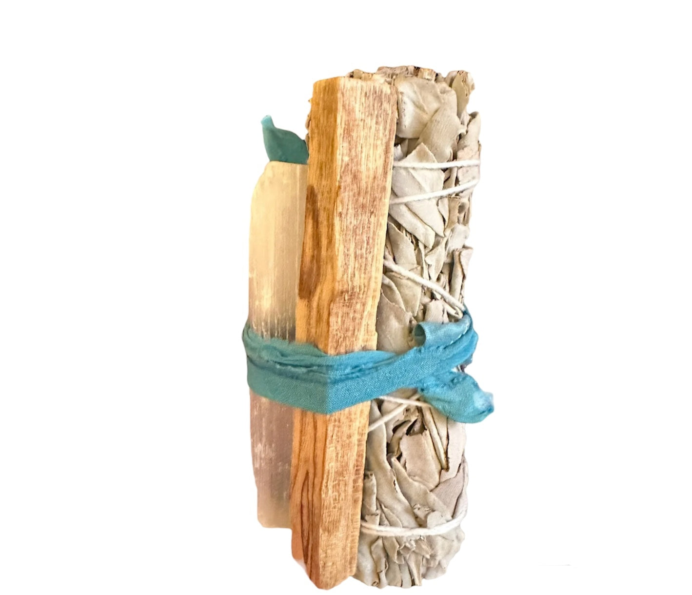 White Sage bundle+Palo Santo wand+Selenite wand, and an information card.
