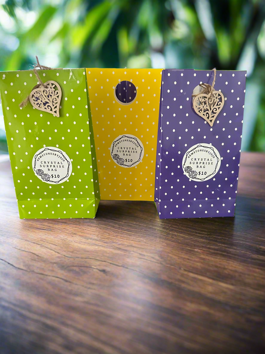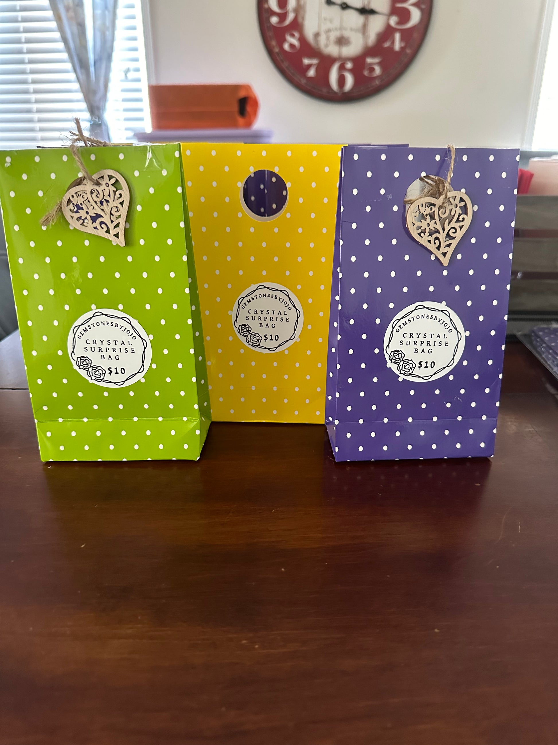 2 randomly picked tumbled crystals, 2 raw crystals and one gemstone necklace.