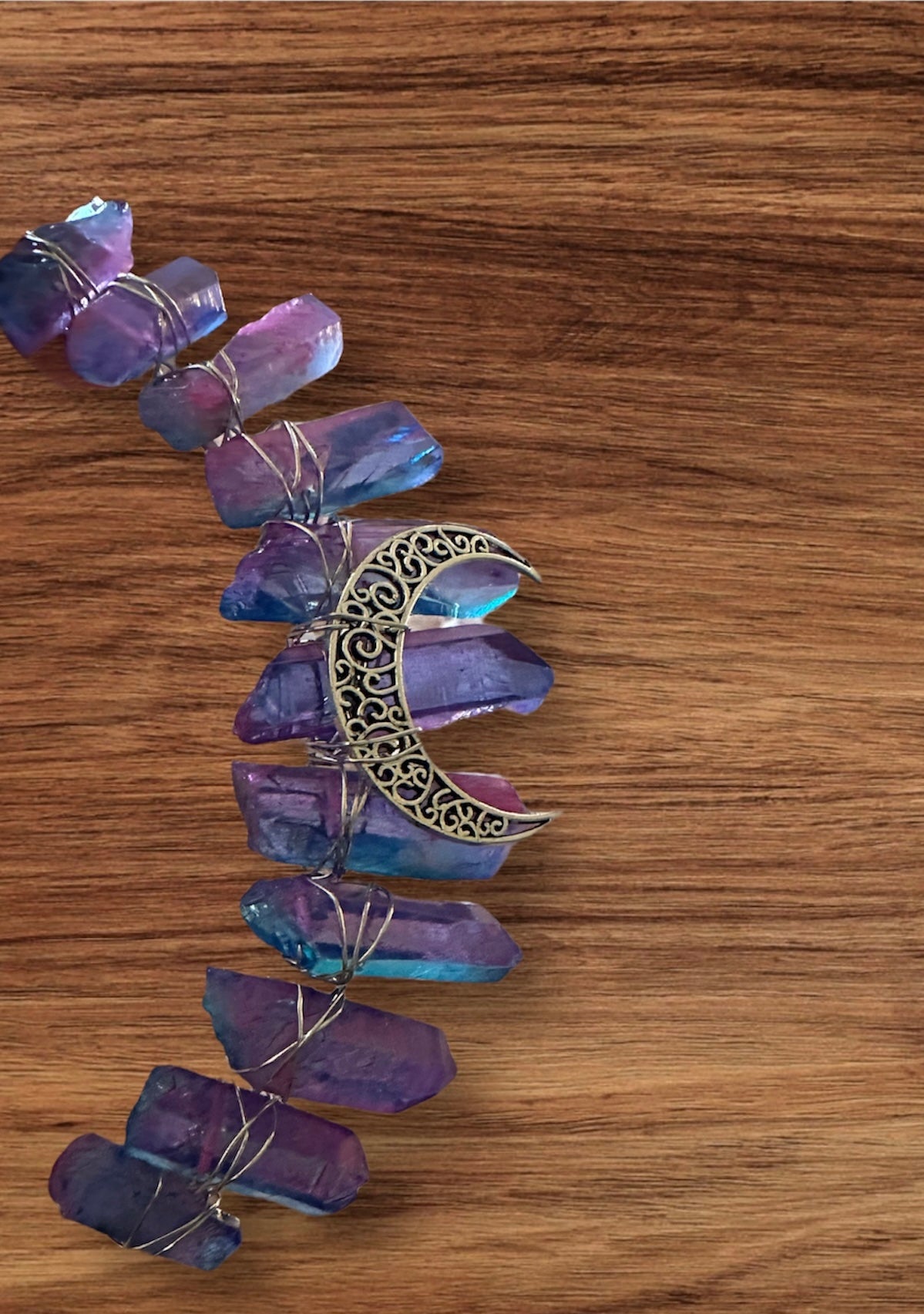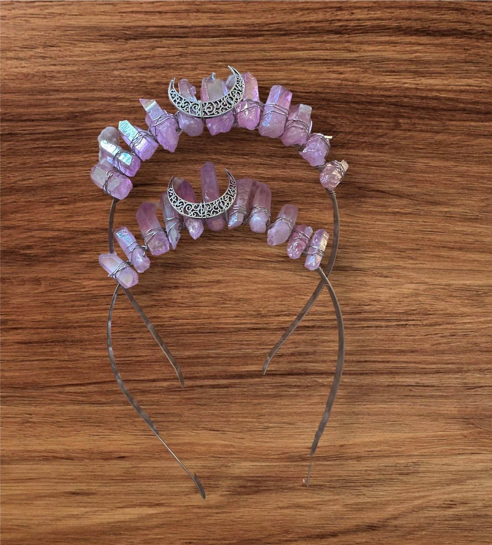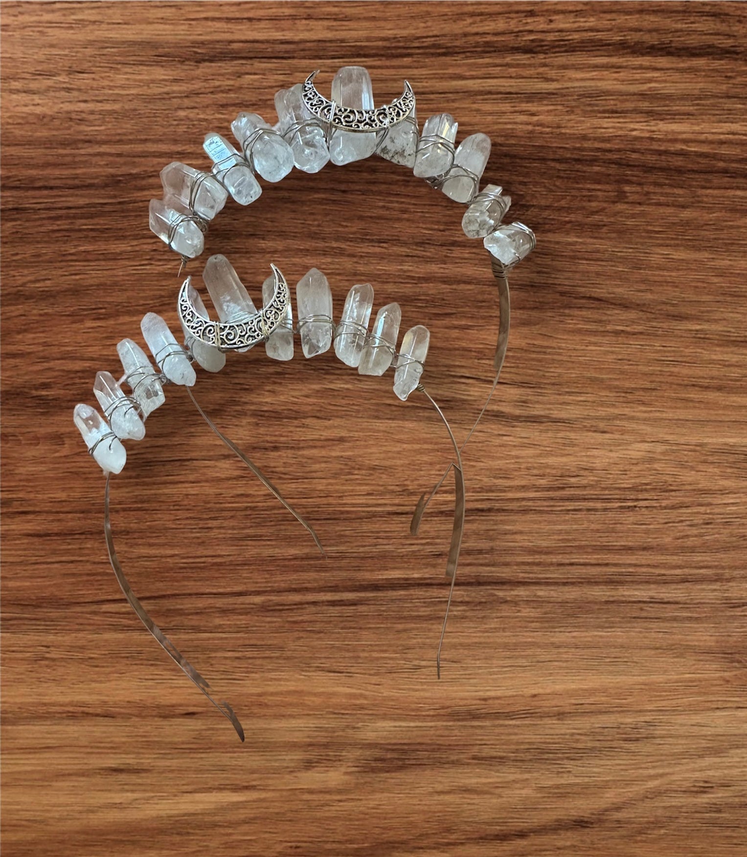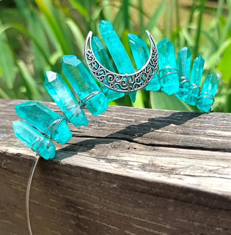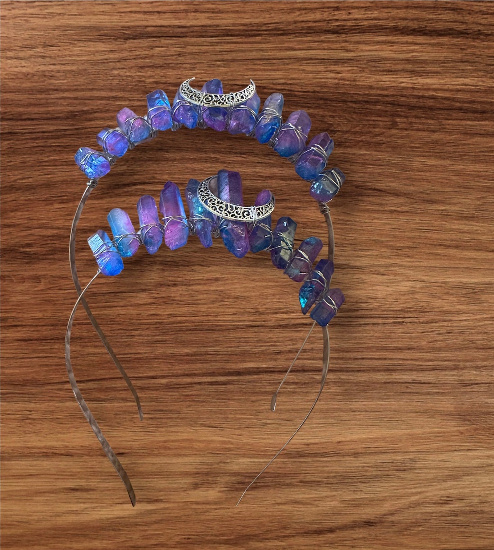 Unleash your goddess with stunning crescent moon goddess crowns adorned in aura crystals or Clear Quartz.