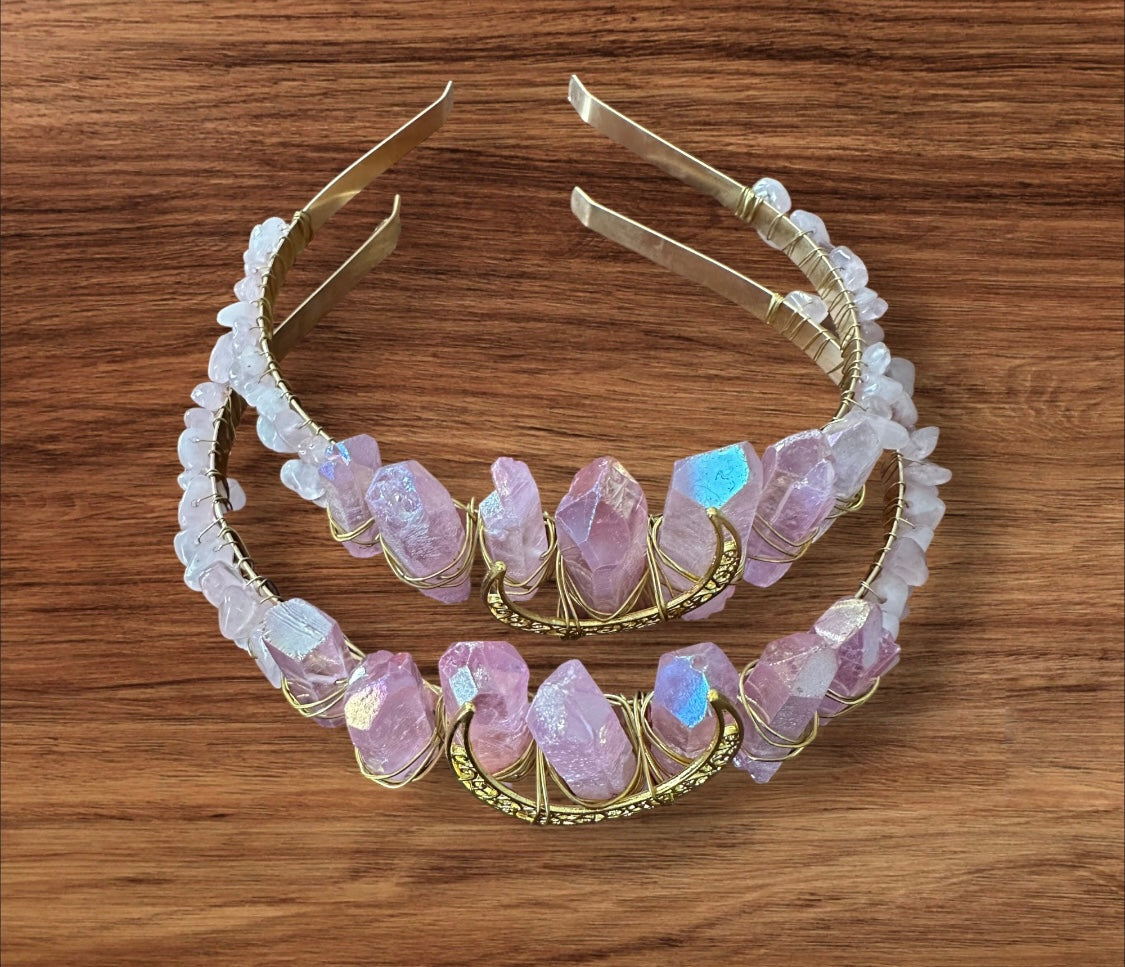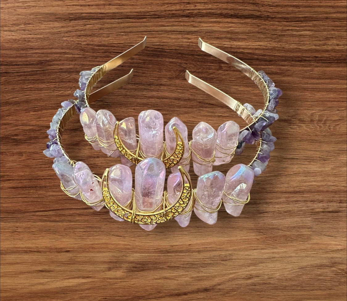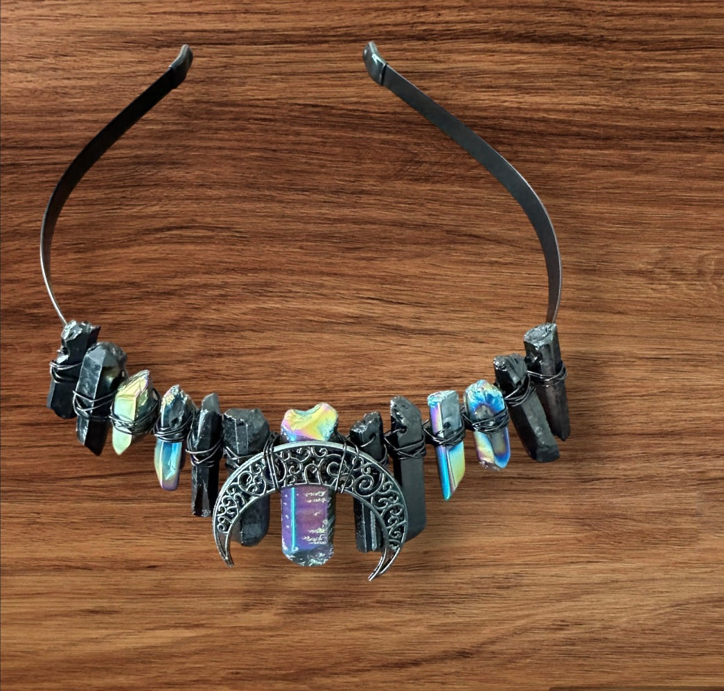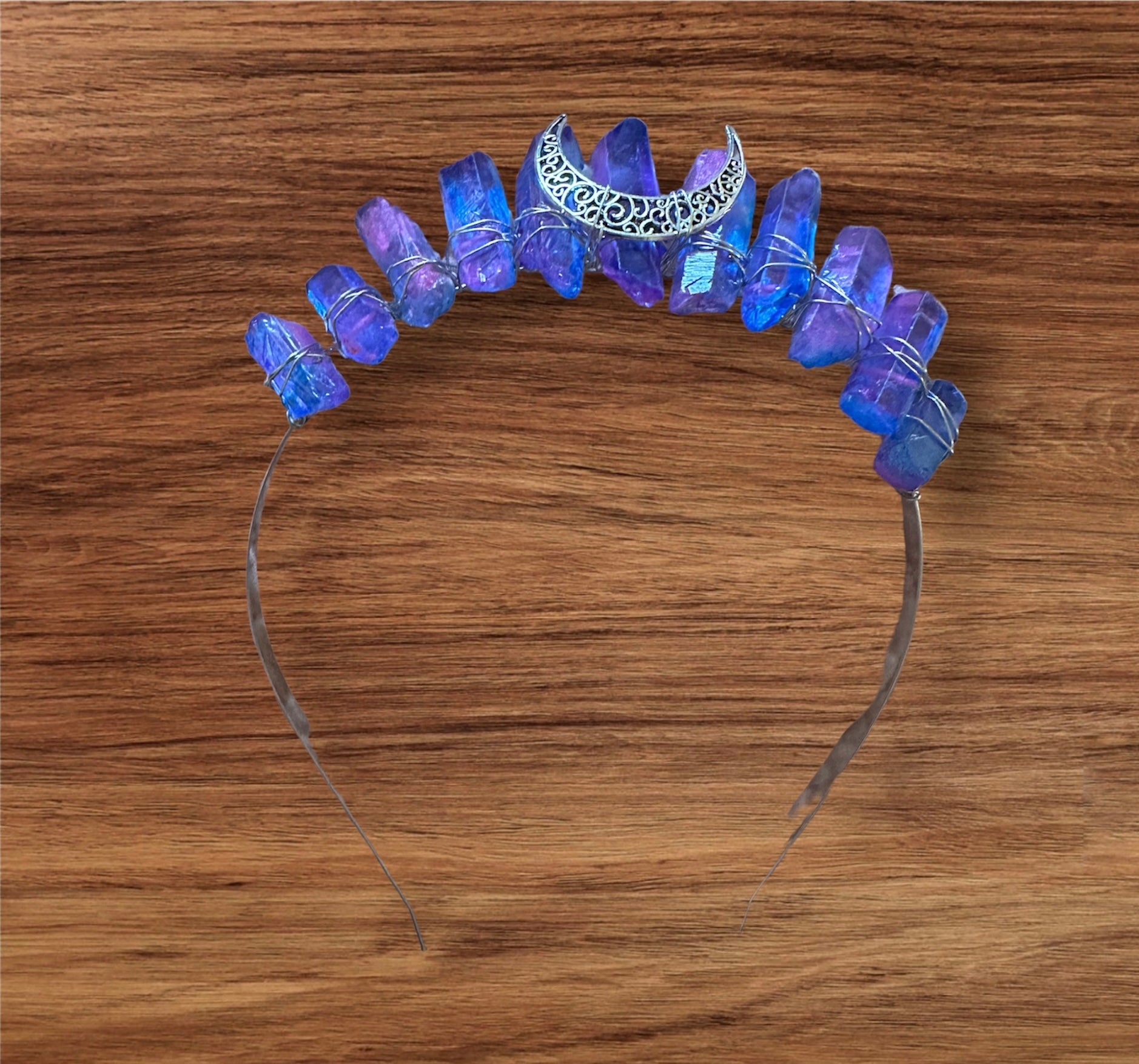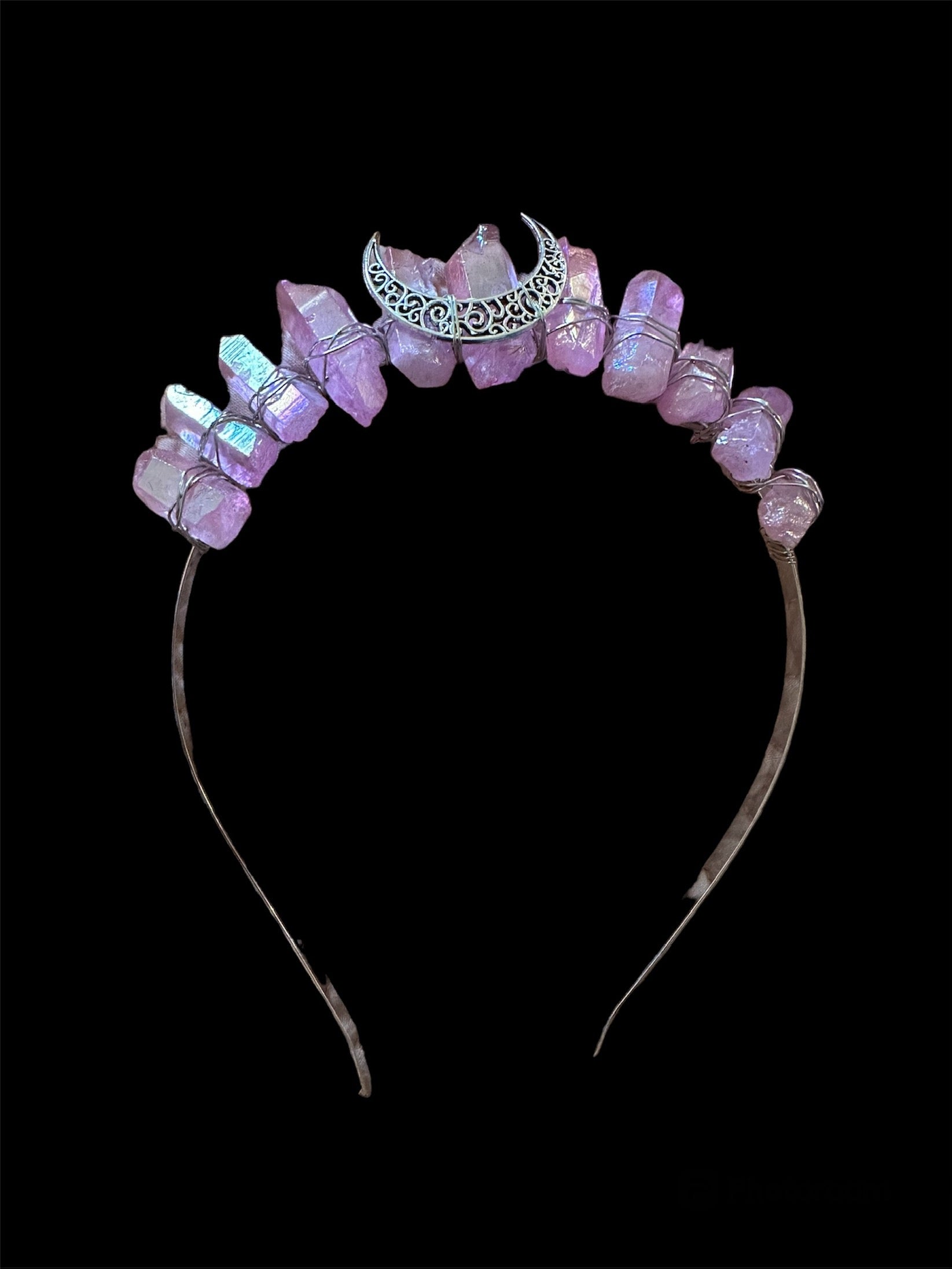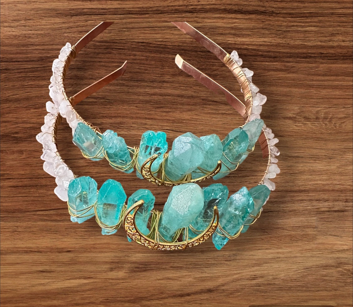 Unleash your goddess with stunning crescent moon goddess crowns adorned in aura crystals or Clear Quartz.