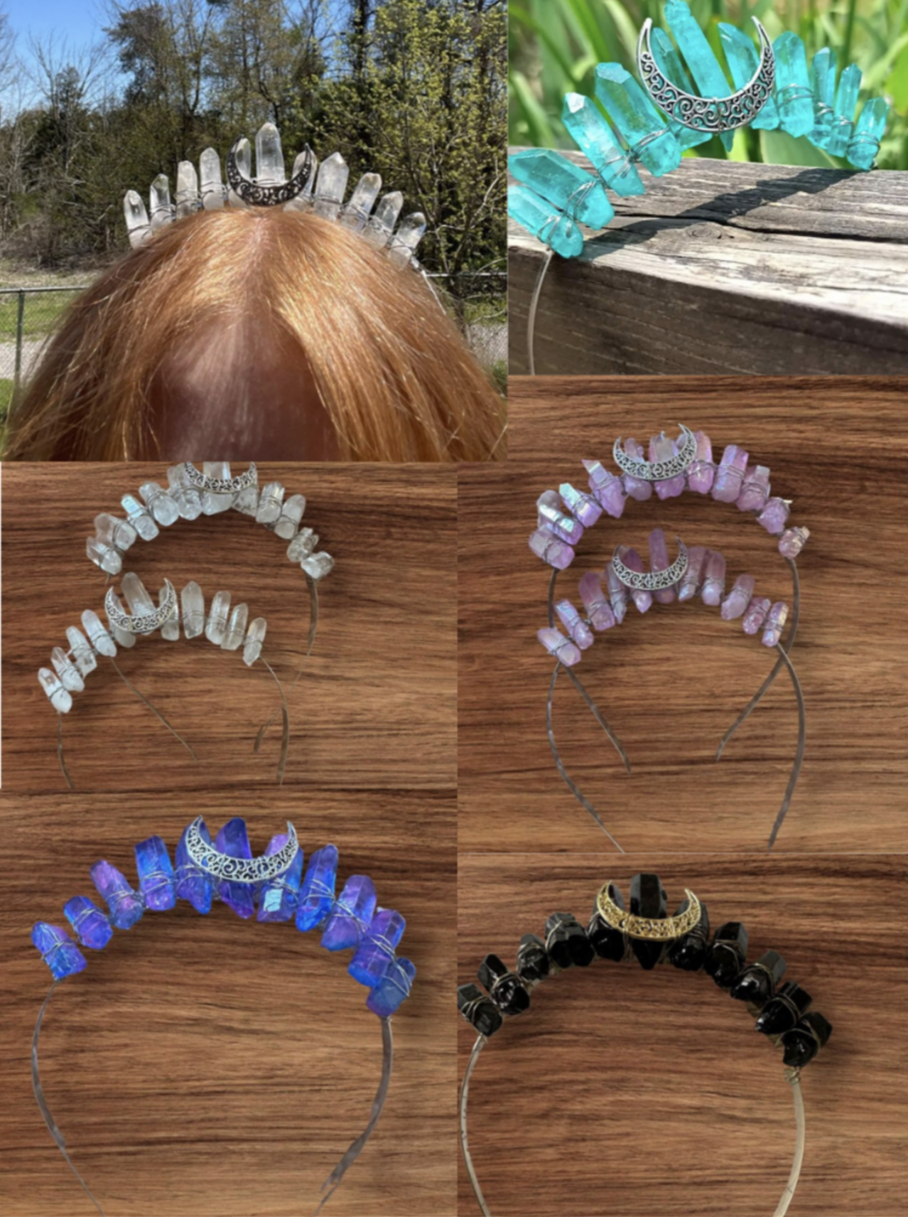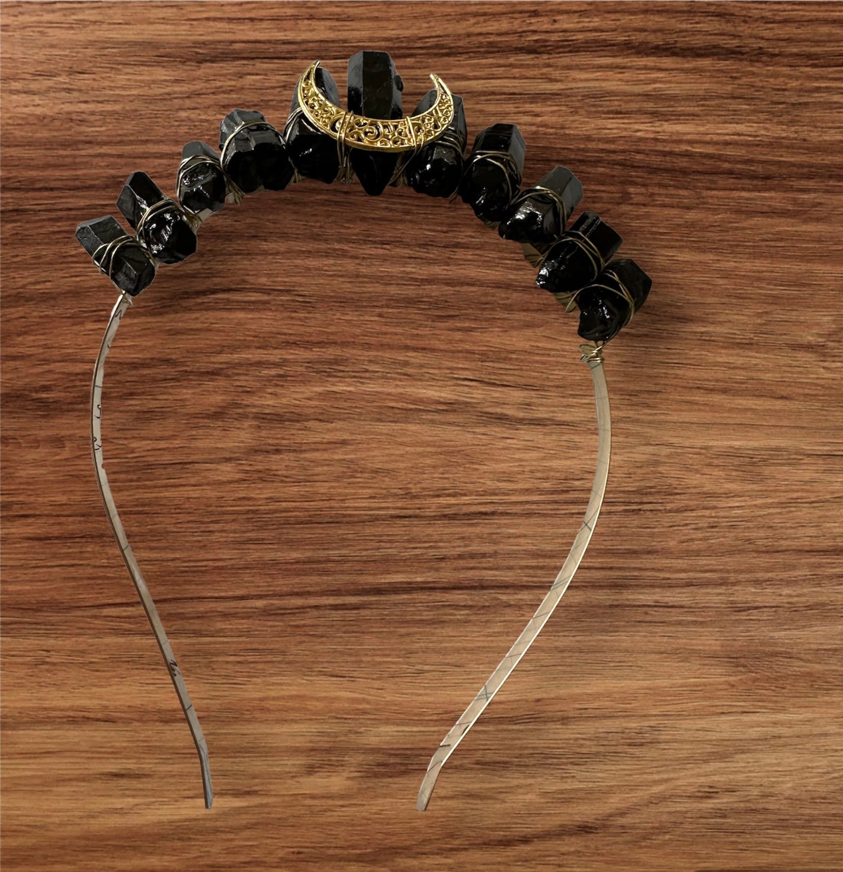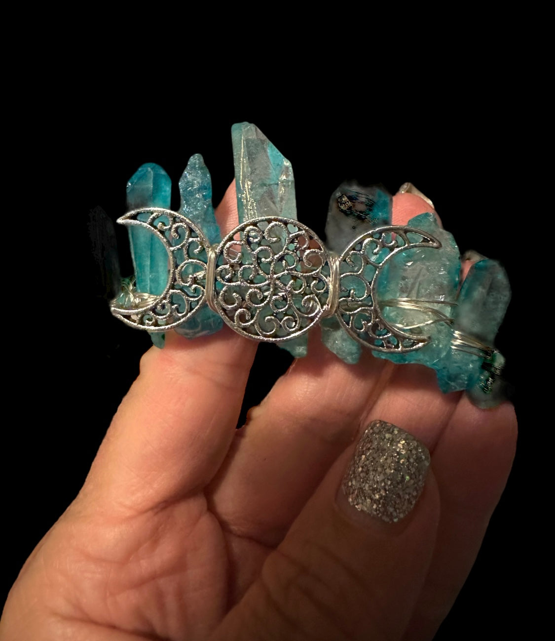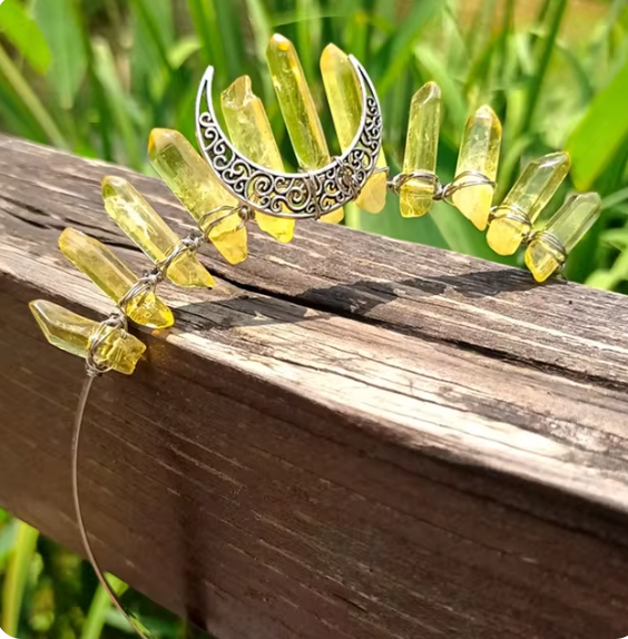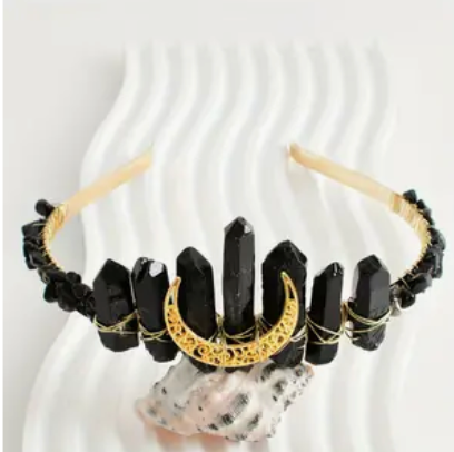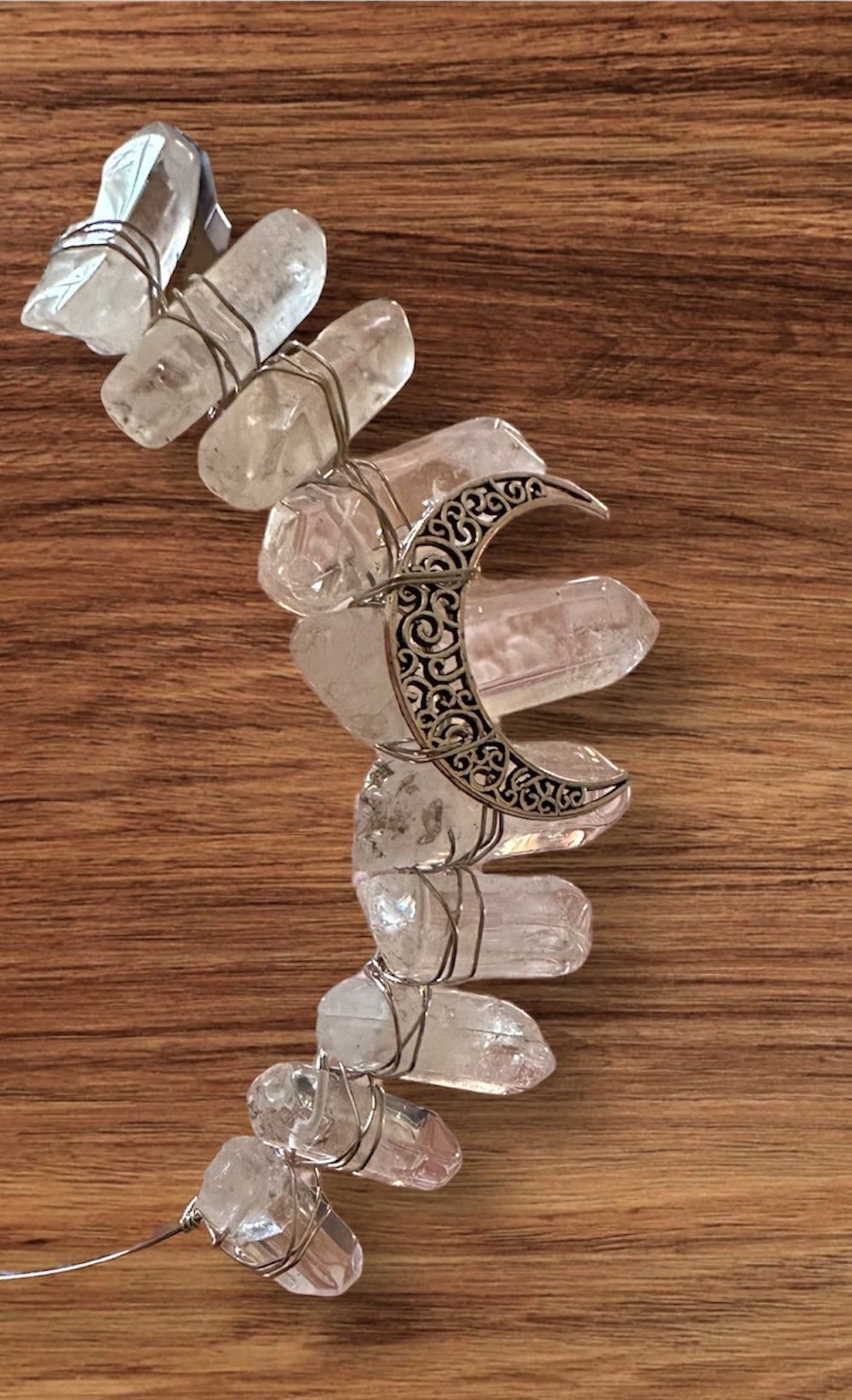 Unleash your goddess with stunning crescent moon goddess crowns adorned in aura crystals or Clear Quartz.