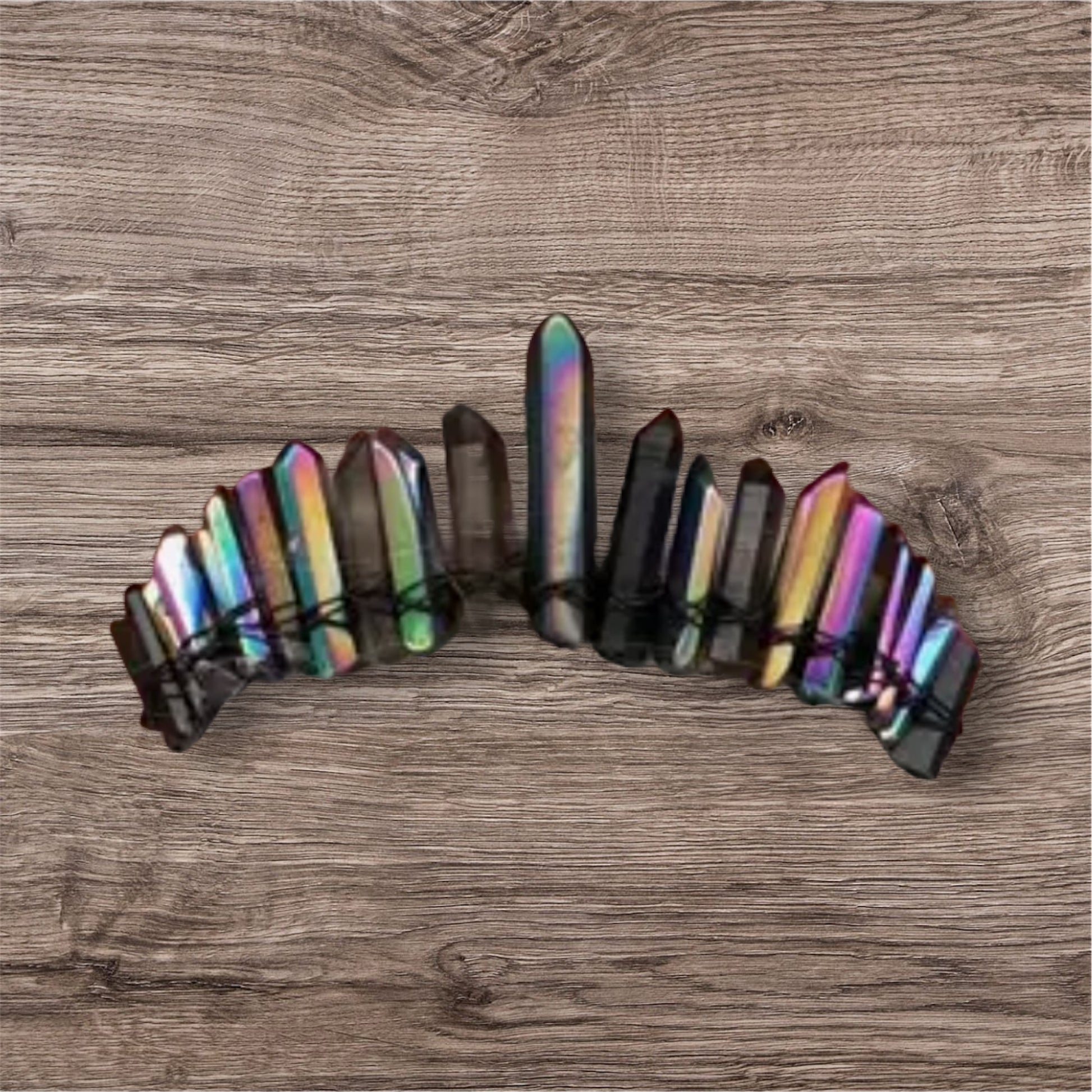 Aura coating is a treated finish over natural quartz crystals to enhance energy and provide bright iridescent colours. Crowns are handmade and will each be unique. Aura Quartz points may have varying shades or colour patterns compared to the images shown.