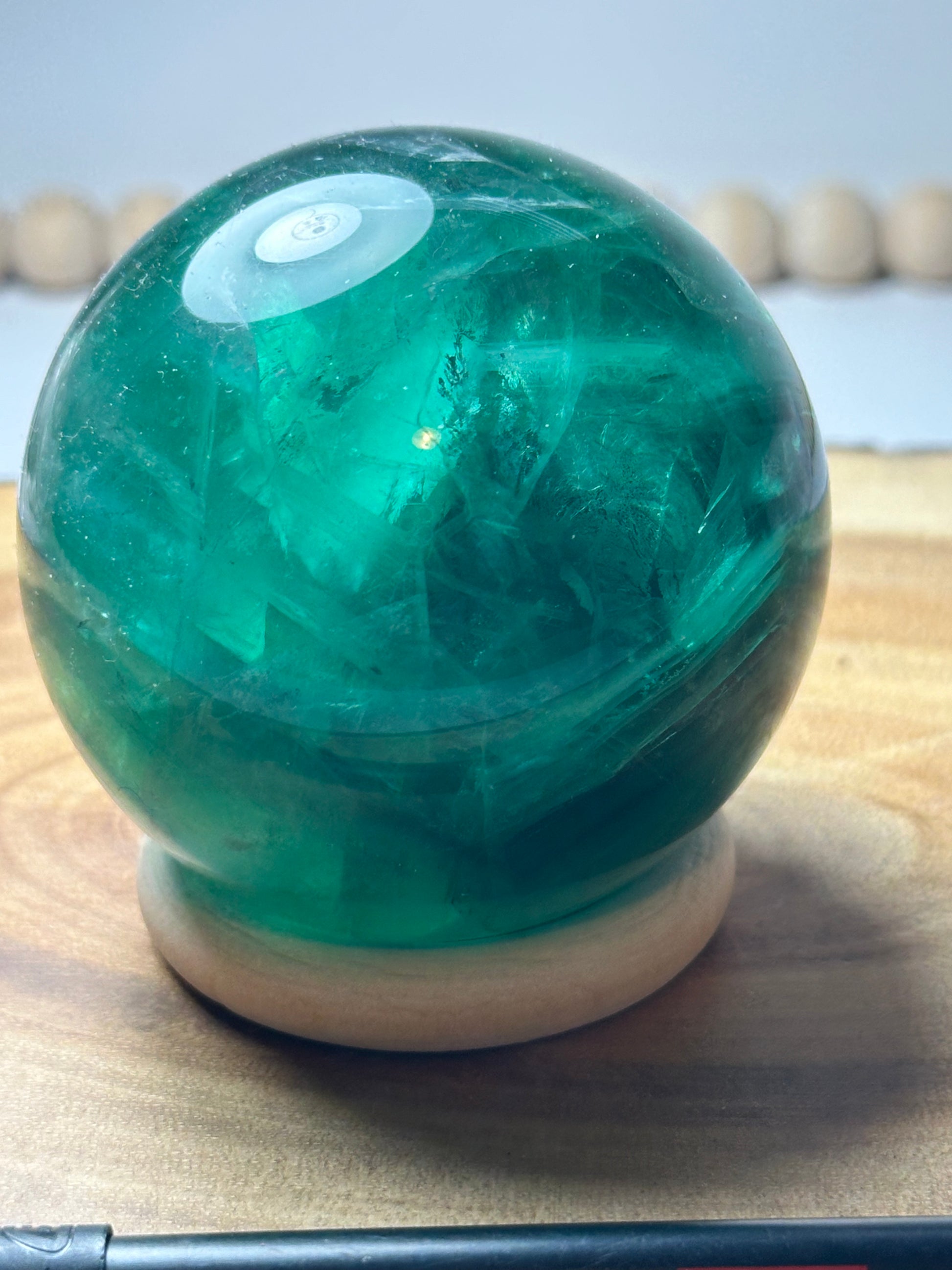 Green Fluorite Sphere is the great harmonizer, making sense out of confusion and helping organize and reframe thoughts. Green Fluorite restores order and promotes peace in the mind, body, and environment. Often referred to as the “genius stone,” Green Fluorite strongly connects intelligence and mental aptitude.