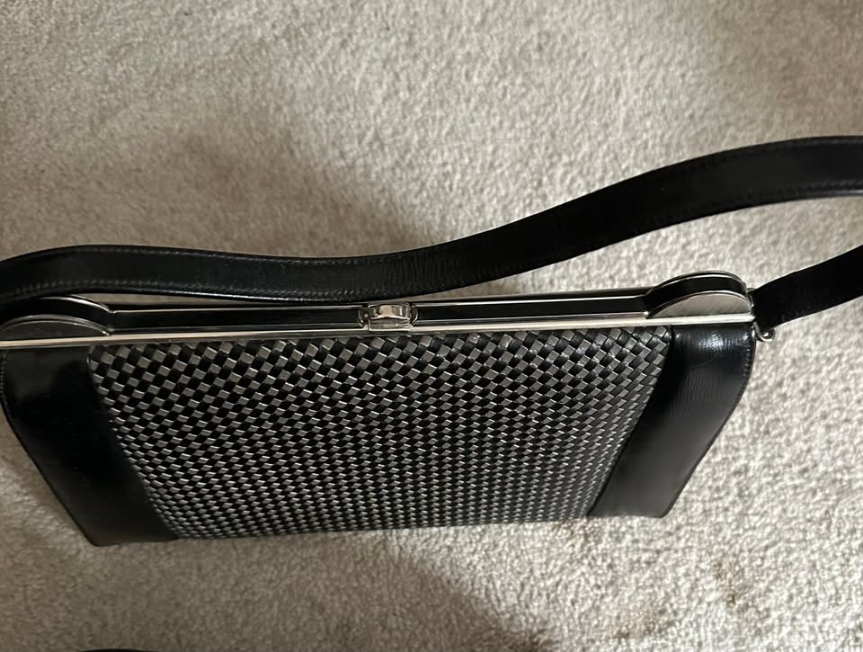 3. Vintage black weaved clutch handbag. with 3 inside pockets and a mirror. 12-inch drop from handle to bottom and 6x10 inches in size with purse feet.