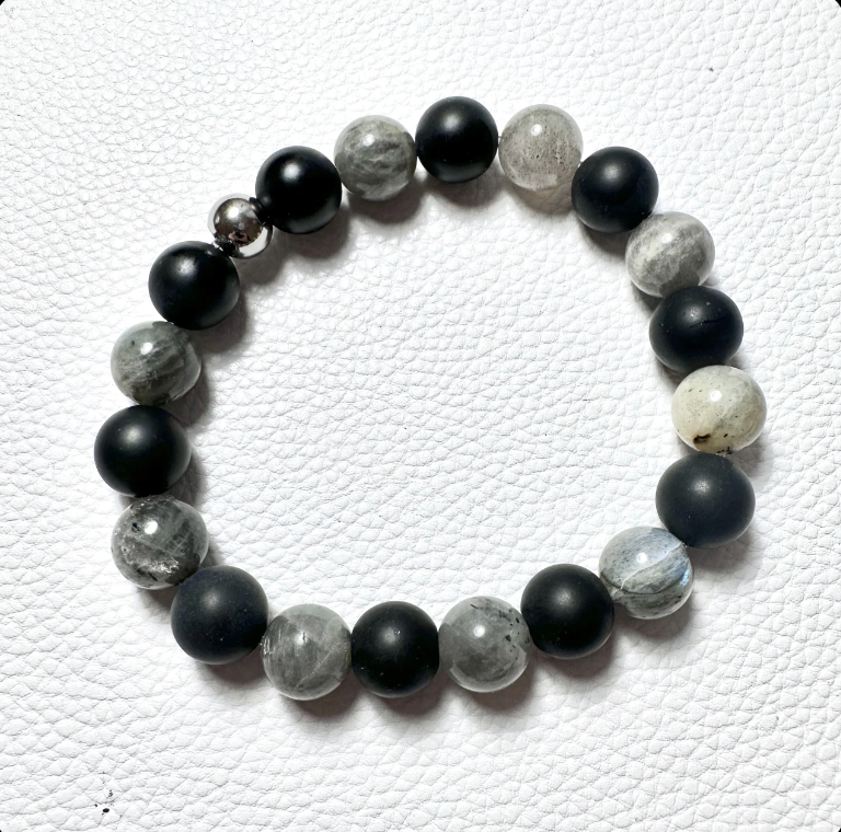 Labradorite and Onyx 10mm bead bracelet with a stainless steel charm 10mm beads