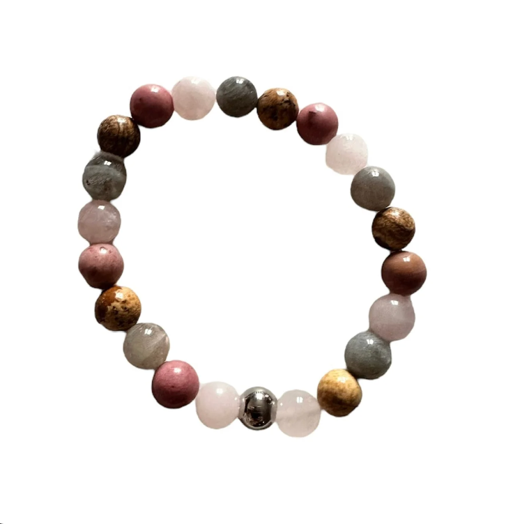 Labradorite, Rose Quartz, Picture Jasper, and Rhodonite gemstone bracelet.