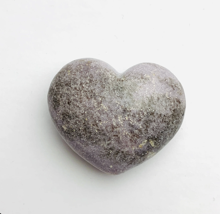 Lepidolite puffy heart measuring 38mm width x 22mm depth x 45mm height.