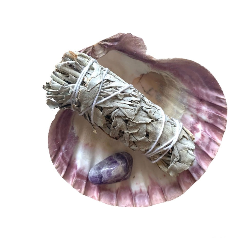 This set includes a large lion paw shell, one white sage bundle, and an Amethyst crystal.