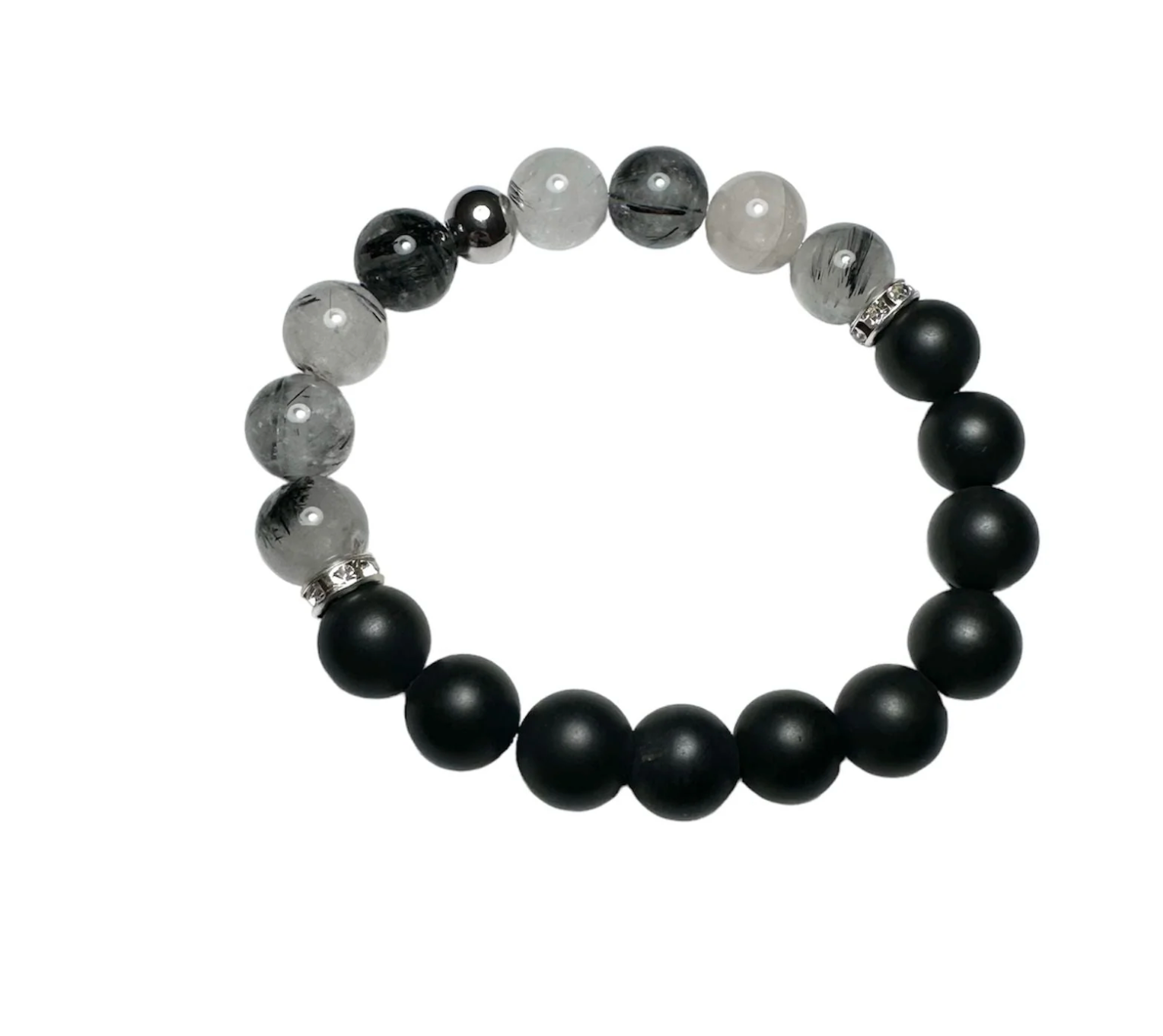 Onyx and Tourmalinated Quartz with a stainless steel charm size 7.5