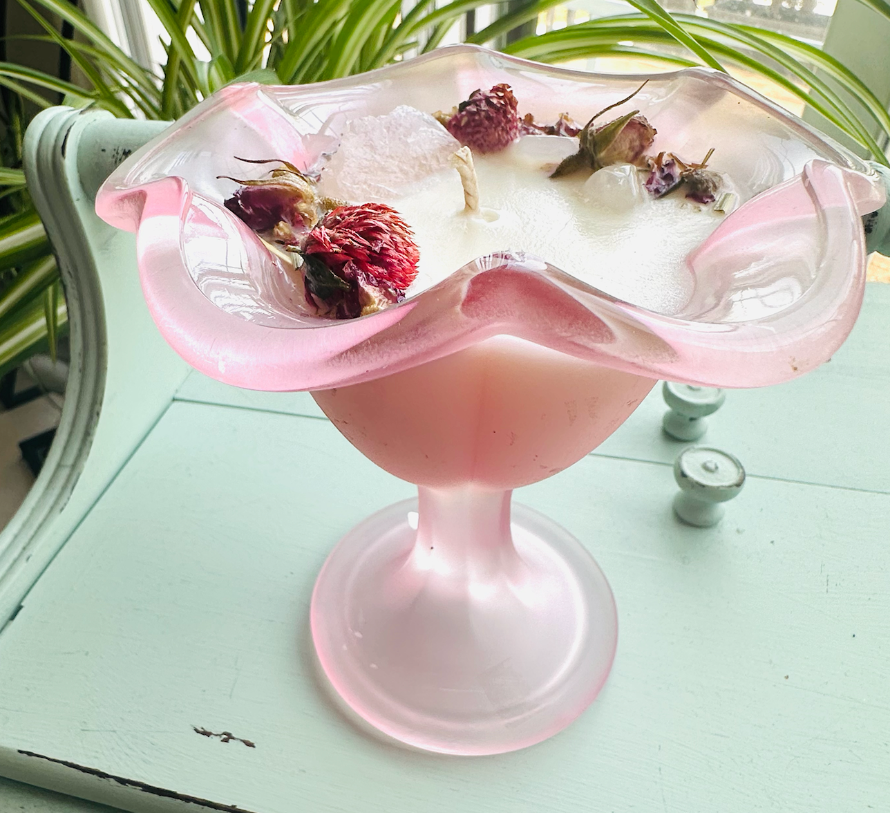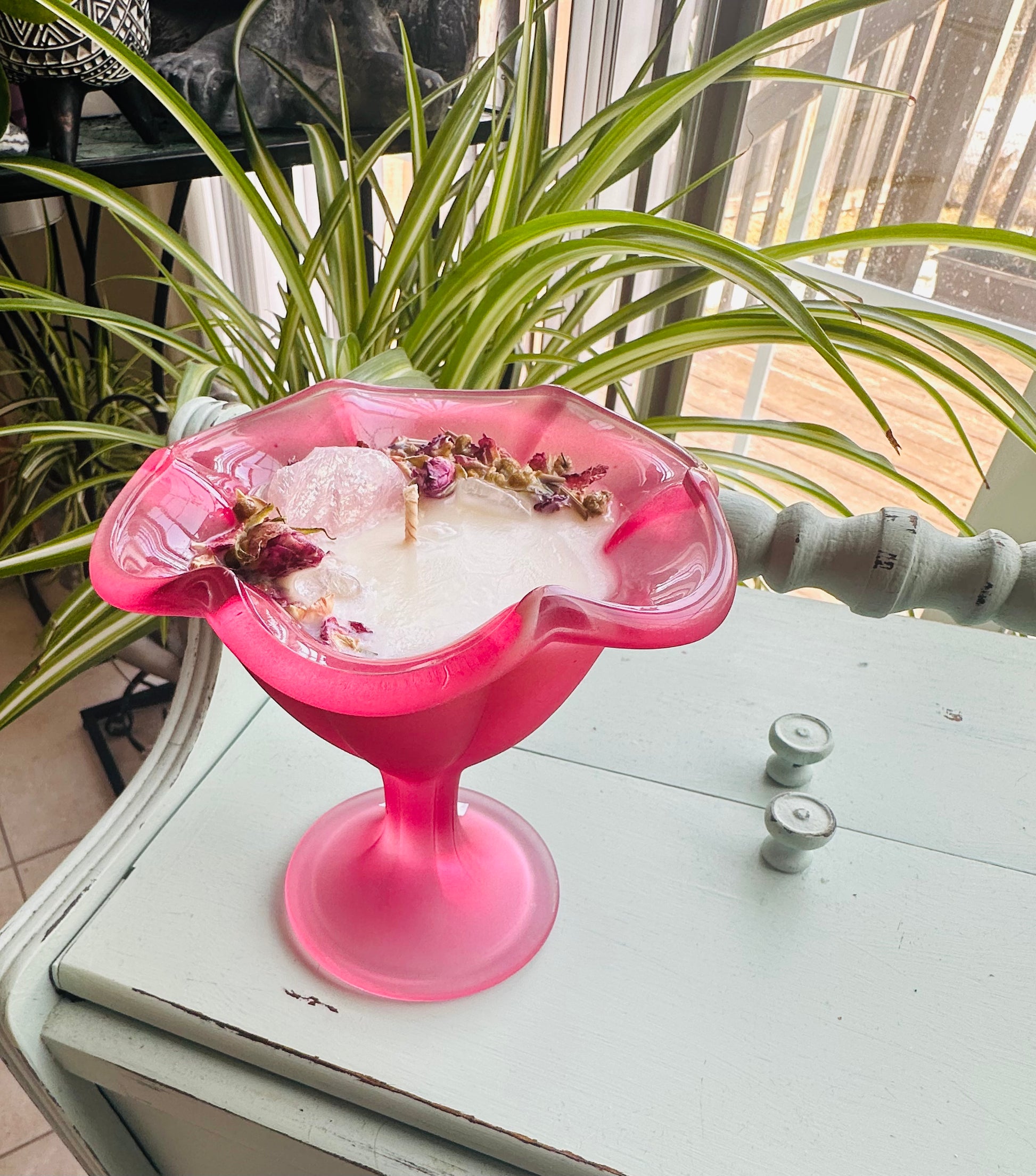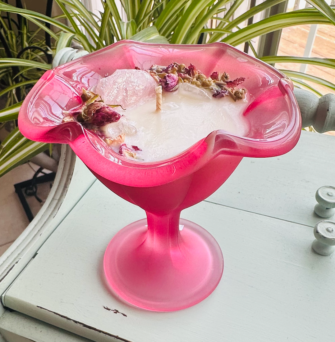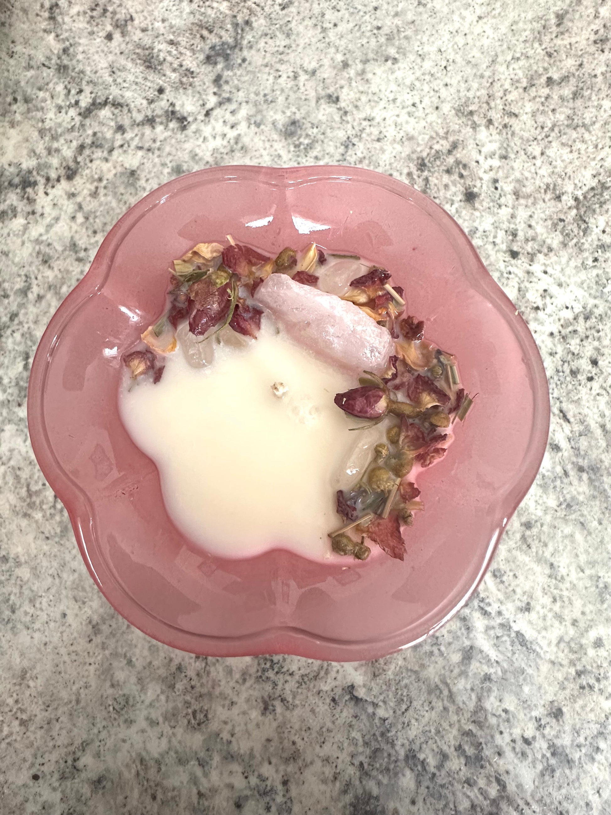 This candle is made with Soy wax with a coconut+vanilla scent+herbs.