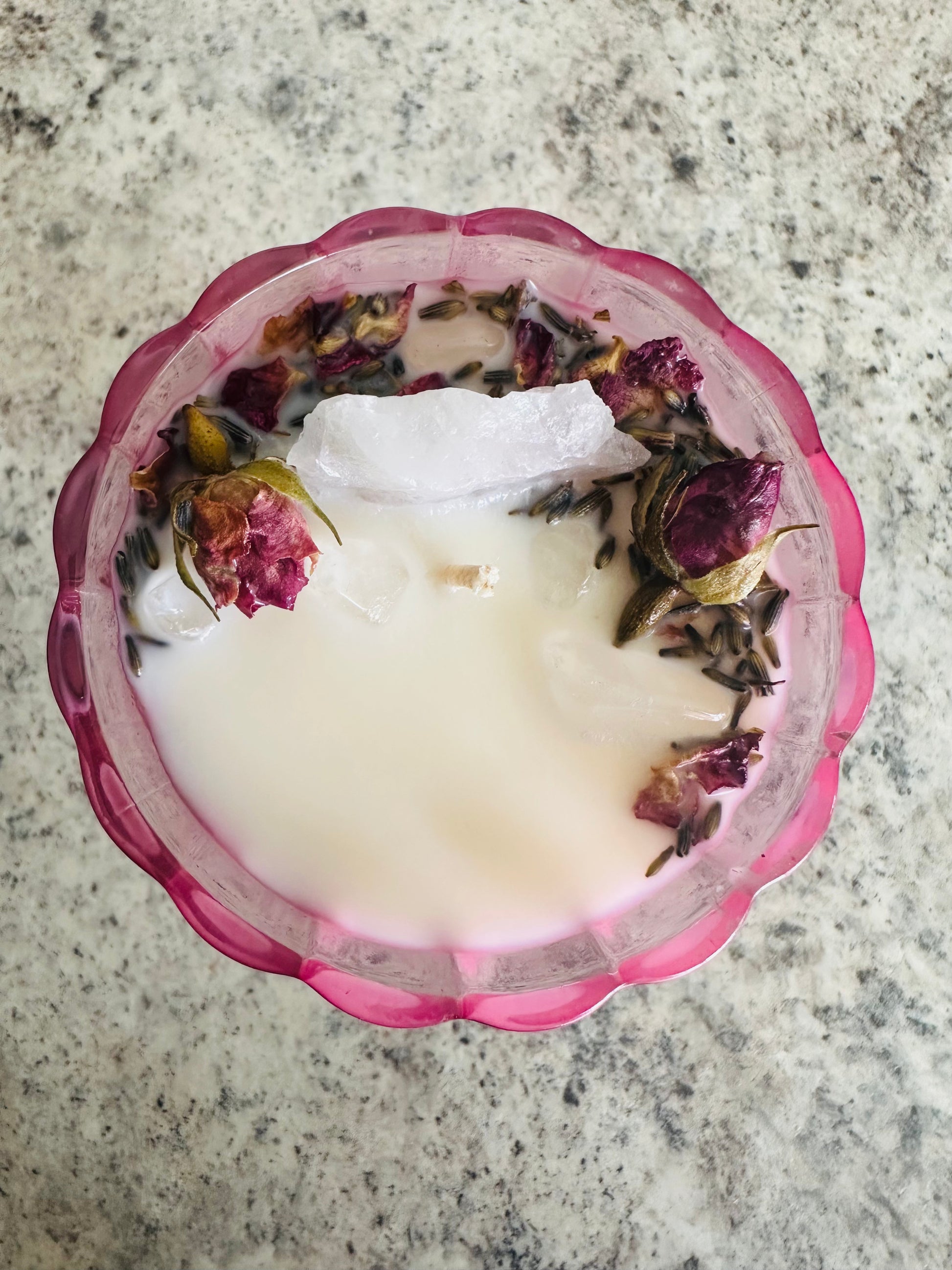 Rose Quartz+ herbs+ flowers+vanilla and lavender scented soy wax PICKUP ONLY AT OUR STORE LOCATION IN OSHAWA, ONTARIO, CANADA! THIS ITEM CANNOT BE SHIPPED, SO PLEASE CONTACT US TO ARRANGE FOR PICKUP. You will receive one (1) vintage glassware piece. Since these pieces are vintage, they will be in good used condition but may show some signs of wear and tear.