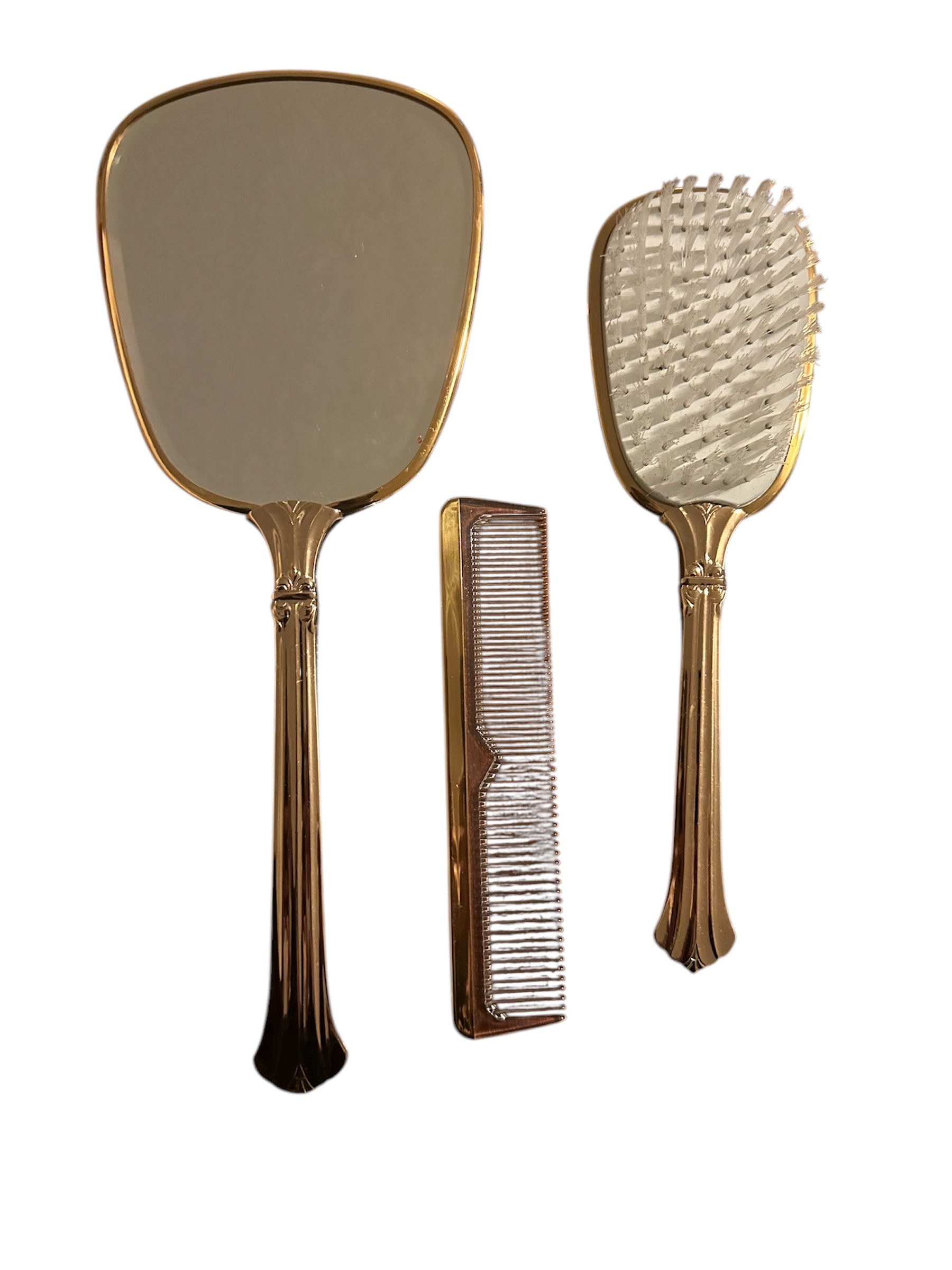 Vintage 3Pc Gold Tone Embellished Dresser Set - Brush, Mirror, Comb set that comes in its original box.