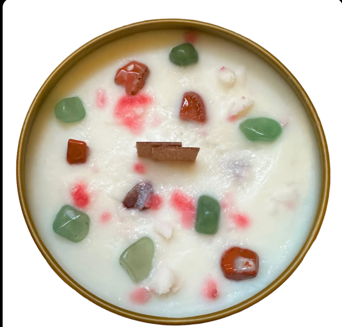 Enjoy the sweet, warm sugar and peppermint scent. This 8 oz soy wax candle has double wooden wicks and gemstone chips.